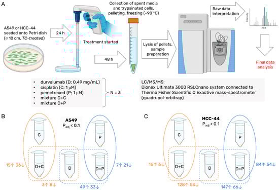 The schematic view of the proteomics experiment and number of hits obtained in this study. (A) Workflow: treatment of cells, sample preparation, and mass spectrometry. (B,C) Number of proteins ((B) for A549, (C) for HCC-44) identified as significantly enriched in the pairwise comparisons of differently treated cells (FDR < 0.1); ↑ indicates higher abundance in the mixture-treated and ↓ indicates higher abundance in the single agent-treated cells. Abbreviations: C—cisplatin; D—durvalumab; P—pemetrexed.