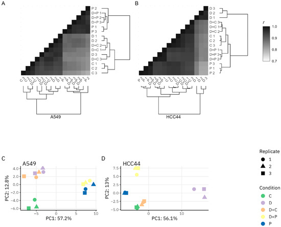 Clustering shows differentiation between the treatments. Correlation with hierarchical clustering (A,B) and PCA analysis (C,D) of top variable proteins in A549 and HCC-44 cell lines. Proteins were filtered based on FDR < 0.05 in any compared treatments within a cell line. Correlation analysis was performed with Pearson’s method; the color code is shown on the right. In the case of PCA, different treatments are shown on the right. Abbreviations: C—cisplatin; D—durvalumab; P—pemetrexed.