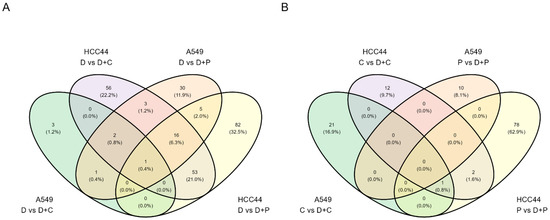 Venn diagrams of the differentially expressed genes in various treatment comparisons in two cell lines. (A) Comparison of treatments involving only durvalumab vs. mixture of durvalumab with a chemotherapeutic agent; (B) comparison of treatments involving only chemotherapeutic agent vs. mixture of durvalumab with a chemotherapeutic agent. Proteins with FDR < 0.05 in any compared treatments within a cell line were considered significant.