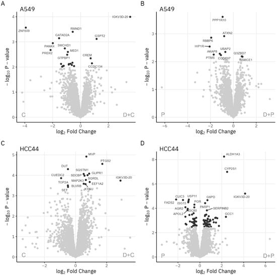 Volcano plots showing effects of chemotherapeutic agent addition to the treatment mixture. (A,B) A549 cell line, comparison of treatments D + C vs. C (A) and D + P vs. P (B). (C,D) HCC-44 cell line, comparison of treatments D + C vs. C (C) and D + P vs. P (D). Proteins marked in black are considered significantly differentially expressed (FDR < 0.05). IGKV3D-20 is a fragment of durvalumab.