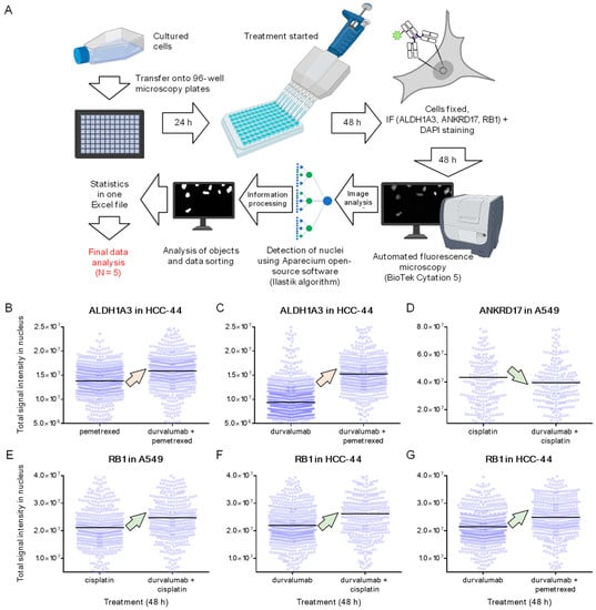 The schematic view of IF experiments. (A) Workflow: treatment of cells, sample preparation, fluorescence microscopy, and data analysis. (B–G) Representative results from a single IF experiment: (B,C), aldehyde dehydrogenase 1 family member A3 (ALDH1A3) nuclear staining; (D) ankyrin repeat domain-containing protein 17 (ANKRD17) nuclear staining; (E–G) retinoblastoma transcriptional corepressor 1 (RB1) nuclear staining. The compared treatments are shown on the x-axis of the graphs. In each graph, each blue circle indicates the signal intensity in an individual nucleus and the thick black line shows the population mean. Arrows show the trend observed in proteomics and IF (up, higher protein levels in the mixture than in the individual drug-treated cells; down, lower protein levels in the mixture than in the individual drug-treated cells). The color of the arrows shows whether the known physiological function of the given protein and the trends observed in this study (increase/decrease in abundance in the mixture-treated cells) indicate participation of validated protein in chemosensitivity (light green) or resistance (light orange) mechanisms.