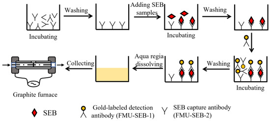The procedures of ALISA are shown in Figure 1. In brief, SEB capture antibody (FMU-SEB-2) was diluted to 10 μg/mL with 0.05 M carbonate buffer (pH 9.6) and 100 μL diluted FMU-SEB-2 was added to a 96-well microplate, followed by incubating overnight at 4 °C. The microplate was washed three times with PBS containing 0.05% Tween 20 (v/v) (PBST, pH 7.4), and then 100 µL/well of serially diluted SEB with dilution buffer (0.5% casein sodium salt in PBS, pH 7.4) or various matrices containing SEB was added. The microplate was incubated at 37 °C for 1 h and then washed three times with PBST to remove the unbounded SEB. Afterwards, AuNPs-labeled FMU-SEB-1 dilution solution (100 µL/well) was added to the wells and incubated at 37 °C for 1 h. After three washes with PBST, the AuNPs were dissolved by adding aqua regia (100 μL/well) to the microporous plate for 15 min. The solution in the well was collected with a micropipette and transferred to a polypropylene tube. In order to avoid corrosion of the graphite furnace, the solution was boiled in a water bath for 30 min to remove volatile hydrochloric acid, the volume was adjusted to 100 μL with deionized water, and the gold atoms were detected on the graphite furnace.