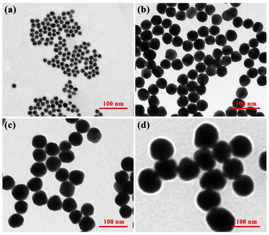 TEM image of (a) 15 nm AuNPs, (b) 40 nm AuNPs, (c) 60 nm AuNPs, and (d) 80 nm AuNPs.