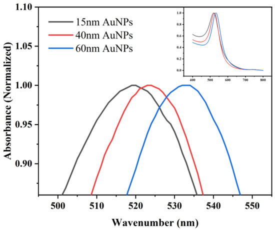 The characteristics of AuNPs of different sizes with visible spectroscopy.