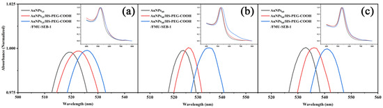 The visible absorption spectra confirmed the formation of AuNP/SH-PEG-COOH and AuNP/SH-PEG-COOH/FMU-SEB-1 bioconjugate, as shown in Figure 5. Black lines in Figure 5a–c showed the visible absorption spectra of AuNPs at 15 nm, 40 nm, and 60 nm. Figure 5 (red line) displayed the visible absorption spectra of HS-PEG-COOH modified AuNPs, which showed that the visible absorption spectra of the PEG-modified AuNPs were all red-shifted. The resonance wavelength and bandwidth of AuNPs are dependent on the particle size and shape, the refractive index of the surrounding medium, and the temperature. This shift shows the changes of the dielectric nature surrounding the AuNPs due to the association of HS-PEG-COOH molecules with gold nanoparticles to form a stable covalent bond Au-S [33]. The blue lines in Figure 5 showed the visible absorption spectra of antibody modified AuNPs. Similarly, a slight red shift in the extinction maximum was observed upon adsorption of FMU-SEB-1 onto the AuNPs. This spectral shift resulted from a change in the local refractive index due to the protein adlayer and is consistent with previous reports [34]. The displacement lengths of nanoparticles of different sizes are shown in Table 1.