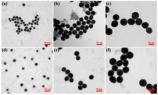 TEM images of (a) 15 nm, (b) 40 nm, and (c) 60 nm antibody modified AuNPs; (d–f) are the images of (a–c) after phosphotungstic acid staining, respectively. The scale bar is 50 nm.