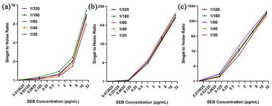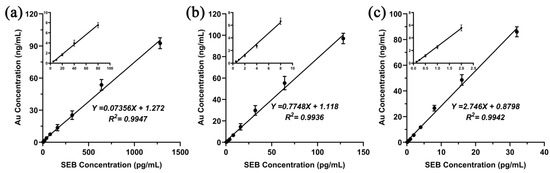 First, the optimal dilution ratio of AuNPs-labeled FMU-SEB-1 was determined. The peak absorbance of AuNPs-labeled FMU-SEB-1 was adjusted to 2.0, and then diluted with diluents (0.5% sodium casein in PBS, pH 7.4) of 1:20, 1:40, 1:80, 1:160, and 1:320, respectively. The SEB concentration was adjusted to 0, 0.01, 0.1, 1, 5, and 20 pg/mL to determine the optimal concentration of AuNPs-labeled FMU-SEB-1 with the best signal-to-noise (S/N) ratio. As shown in Figure 7a, AuNPs-labeled FMU-SEB-1 with a particle size of 15 nm had the highest S/N ratio (2.33) when the SEB concentration was 5 pg/mL and the dilution ratio was 1:160 (positive when S/N ratio > 2.1). AuNPs-labeled FMU-SEB-1 with a particle size of 40 nm had the highest S/N ratio of 4.94–151.56 when the SEB concentration was 1–20 pg/mL and the dilution ratio was 1:80 (Figure 7b). AuNPs-labeled FMU-SEB-1 with a particle size of 60 nm had the highest S/N ratio of 2.01–616.38 at SEB concentration of 0.1–20 pg/mL and dilution of 1:80 (Figure 7c), indicating that AuNPs-labeled FMU-SEB-1 with a particle size of 60 nm has the highest detection sensitivity of about 0.1 pg/mL. Then, serial concentrations of SEB (0.125–1280 pg/mL) were detected by AuNPs-FMU-SEB-1 with the optimal dilution, and the standard curve was drawn between the gold atomic content and the corresponding SEB concentration. The typical standard curves of SEB detection using the ALISA method are shown in Figure 8.