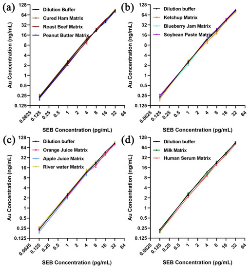 We used different approaches to prepare different matrices. In brief, for the non-soluble solid and semi-solid matrices such as roast beef, peanut butter, soybean paste, cured ham, ketchup, blueberry jam, etc., weigh 10 g of each in a mortar, cut with scissors, add a small amount of dilution buffer (0.5% sodium casein in PBS, pH 7.4), then grind thoroughly in the mortar to a paste and collect the contents in a centrifuge tube. The mortar is rinsed 3 times with an appropriate amount of diluent (0.5% sodium casein in PBS, pH 7.4) and collected in the previous centrifuge tube. Finally, the final pH value is adjusted to 7.4 and the volume adjusted to 20 mL. Place on a vertical mixer for 1 h to allow full leaching of contents. Centrifuge at 1000× g for 10 min at 4 °C to remove particulate matter. The supernatant is transferred to a new centrifuge tube, and the supernatant used to dilute the SEB to final concentrations of 0.125, 1, 4, 8, 16, and 32 pg/mL. For the liquid matrix such as orange juice, apple juice, river water, human serum, milk, etc., take 10 mL of each, dilute with the appropriate diluent (0.5% sodium casein in PBS, pH 7.4) to the final concentration of 50% and adjust the final pH value to 7.4, and place on the vertical suspension instrument for 1 h to fully leach the contents. Centrifuge at 1000× g for 10 min at 4 °C to remove particulate matter. The supernatant is transferred to a new centrifuge tube, and the supernatant used to dilute SEB to final concentrations of 0.125, 1, 4, 8, 16, and 32 pg/mL.