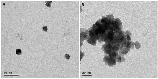 TEM images of CeO2 NPs with different scales: (A) 50 nm and (B) 20 nm.