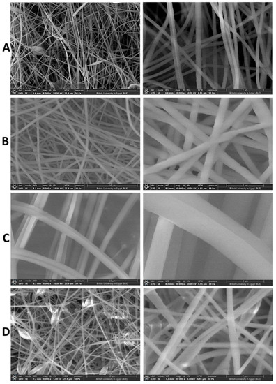 SEM images of (A) blank PAN NFs (F1, 6%), (B) blank PAN NFs (F2, 8%), (C) blank PAN NFs (F3, 10%), and (D) CeO2 NPs-PAN NFs (F4), with magnification power of 8000× (left panel) and 30,000× (right panel).