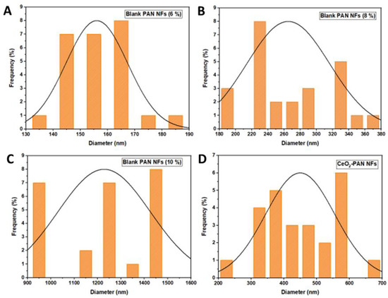 Diameter distributions of (A) blank PAN NFs (6%), (B) blank PAN NFs (8%), (C) blank PAN NFs (10%), and (D) CeO2 NPs-PAN NFs.