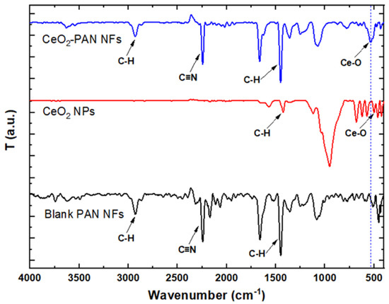 As shown in Figure 4, the spectrum of the blank PAN NFs showed characteristic peaks at 2933 cm−1, 2241 cm−1, and 1454 cm−1, which are determined as C-H stretching, -C≡N stretching, and -C-H bending peaks, respectively [58,59,60]. The FT-IR spectrum of the CeO2 NPs showed a peak at 500 cm−1, corresponding to the Ce-O vibration in the CeO2 NPs [61,62]. The FT-IR spectrum of the CeO2-PAN NFs revealed characteristic peaks at 2933 cm−1, 2241 cm−1, and 1454 cm−1, which are determined as C-H stretching, -C≡N stretching, and -C-H bending peaks, respectively. Interestingly, the peak at 500 cm−1 in the spectrum which corresponds to the Ce-O peak of the CeO2 NPs was shifted to 533 cm−1 after incorporating the CeO2 NPs, as demonstrated in the FT-IR spectrum of the CeO2-PAN NFs. Additionally, no peaks were newly formed nor disappeared, which indicates the absence of chemical interactions between PAN NFs and CeO2 NPs [62] and that the polymeric solution of PAN and CeO2 NPs was just physically mixed together.