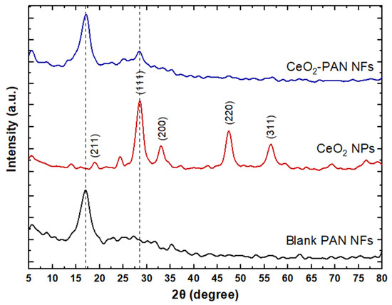The fabricated nanofibrous mats were analyzed using XRD to investigate their crystalline properties. The diffraction patterns are shown in Figure 5. The diffraction peaks of the CeO2 NPs at 2θ = 28.5°, 33°, 47.4°, and 56.3° correspond to the (111), (200), (220), and (311) crystal planes, respectively, having a cubic CeO2 structure with the Inorganic Crystal Structure Database (ICSD) reference code 01-071-4199, along with a low-intensity peak at 2θ = 19° indexed as (211) for cubic Ce2O3 based on ICSD 01-072-6357 [61,63]. The XRD pattern of PAN showed a semicrystalline structure with a sharp diffraction peak superimposed on a hump at 2θ = 17° [62,64]. A comparison of the XRD of the blank PAN NFs with that of the CeO2-PAN NFs showed the appearance of a strong peak at 2θ = 28° (111) as well as the disappearance of all the other CeO2 NPs peaks, which could be attributed to the destruction of the NPs’ crystal lattice. This could be explained by the encapsulation of the NPs in the nanofibrous mats.