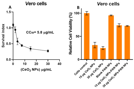 (A) CC50 of CeO2 NPs in Vero cells; (B) cell viability (%) via MTT assay of CeO2 NPs and CeO2-PAN NFs in Vero cells. Results are represented as means ± SD.