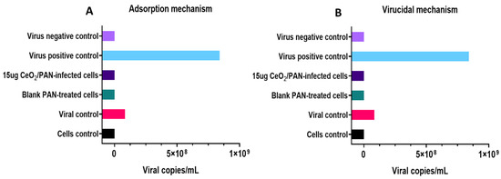 The viral titration of ADV-5 (the dilution of the virus that can kill 50% of cells) was found to be 105 copies/mL, which is equivalent to a 1:100 dilution of the viral stock that was used in the antiviral assay. The results of the performed experiments using qPCR are presented in Tables S2 and S3. As illustrated in Figure 7, the results show that blank PAN (8%, w/v) and 15 µg CeO2-PAN NFs exert their antiviral activity via adsorption and virucidal mechanisms, as evidenced in the undetected viral copies using a qPCR assay. The tested samples were able to inhibit the entry of virus particles into host cells, as well as prevent viral infectivity via virucidal mechanisms after incubation with the virus for 1 h.