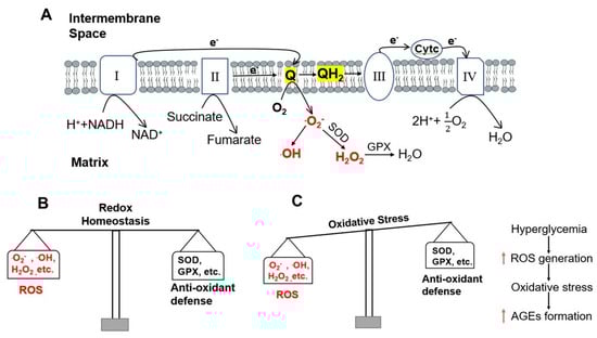ROS generation and oxidative stress induced by hyperglycemia. (A) Electrons pass through the four complexes of the respiratory chain and ROS formation in mitochondria. Electrons from complexes I and II are transferred to ubiquinone (Q) and Q is reduced to ubiquinol (QH2). QH2 passes electrons to complex III, which passes them to a small mobile protein, cytochrome c (Cytc), and then to complex IV. When the entry of electrons and/or the flow of electrons through the respiratory chain are imbalanced, the intermediate radical ∙Q− can donate an electron to oxygen (O2) to produce superoxide free radical ∙O2−. ∙O2− can form hydroxyl free radical ∙OH or can be converted to hydrogen peroxide (H2O2) by superoxide dismutase (SOD). H2O2 is further converted to water (H2O) by glutathione peroxidase (GPX). (B) Redox homeostasis under normal conditions. (C) Oxidative stress in hyperglycemia increases the formation of AGEs.