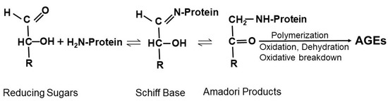 AGEs are formed through non-enzymatic reactions between reducing sugars and proteins, lipids, or nucleic acids under hyperglycemic and oxidative stress states. As shown below in Figure 2, the non-enzymatic reaction between reducing sugar and free amino groups of amino acids form a reversible and non-stable Schiff base, which is further rearranged to form a more stable but also reversible Amadori product. Amadori products can undergo various reactions involving oxidation, dehydration, polymerization, and oxidative breakdown to form various AGEs [24,25,26]. Reducing sugars and free amino groups on DNA can undergo Amadori reactions to lead to the formation of DNA-AGE [27]. Lipid peroxidation can also generate advanced lipoxidation end-products [28]. Thus, AGEs form from non-enzymatic glycation of proteins and other macromolecules during the hyperglycemia in diabetes [29], particularly under conditions of increased oxidative stress.