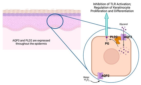 The aquaporin-3 (AQP3)/phospholipase-D2 (PLD2)/phosphatidylglycerol (PG) signaling pathway. Keratinocytes throughout the epidermis express AQP3, a water, glycerol, and hydrogen peroxide (H2O2) channel that associates with the lipid-metabolizing enzyme PLD2, also expressed throughout the epidermis [86]. PLD2 can convert the glycerol transported by AQP3 to the phospholipid PG, which serves as a signal to inhibit Toll-like receptor activation and regulate keratinocyte proliferation and differentiation (please see text). Created with Biorender.com (accessed 30 April 2023).