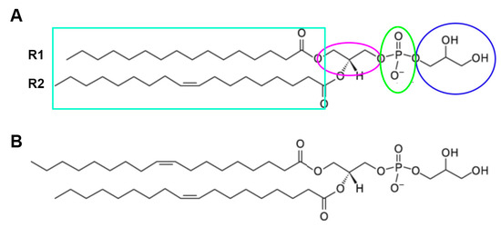 Phosphatidylglycerol. The structure of PG is shown, with the glycerol headgroup (circled in blue), the phosphate linker (green ellipse), and the glycerol backbone (magenta ellipse). The two fatty acid tails (R1 and R2 in the teal box) are also shown, each of which can be one of multiple fatty acids of varying carbon chain lengths and degrees of saturation. (A) The PG species illustrated is 1-palmitoyl-2-oleoyl-PG. (B) The structure of dioloeoylphosphatidylglycerol (DOPG) is shown. Adapted from the Avanti Lipids, Inc. website (https://avantilipids.com/product/841138; accessed on 30 April 2023).