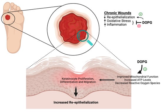 Chronic wounds are characterized by poor re-epithelialization, increased oxidative stress, and inflammation. As discussed in this review, data in the literature show that DOPG improves mitochondrial function, which suggests that DOPG might enhance wound healing via this mechanism to increase ATP levels and decrease reactive oxygen species. We have shown that DOPG also promotes keratinocyte proliferation, which should help to restore epidermal integrity. In addition, DOPG’s anti-inflammatory effects should also result in decreased oxidative stress and increased healing even of chronic wounds, such as can occur with diabetes. Created with Biorender.com.