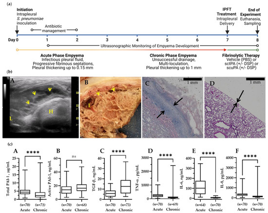 The Model of Chronic Empyema in Rabbits Features Severe Pleural Fibrosis Combined with Increased Pleural Thickening. (a) Schematic time course of initiation and development of chronic Streptococcus pneumoniae -induced empyema modeled in rabbits (0–7 d), followed by treatment (24 h). Infectious pleural injury was initiated by intrapleural injection of S. pneumoniae at time zero. Progression of the pleural fibrosis was monitored by daily ultrasonography [41,42]. The acute phase (yellow) approaches its peak by 3 d. The chronic phase, which involves increased intrapleural organization (red), follows the acute phase. Both standard Intrapleural Fibrinolytic Therapy (IPFT) with sctPA or scuPA or PAI-1-TFT (green) were given at 7 d after initiation of empyema. Excess pleural fluid (up to 10 mL) was drained as needed at 8 h after treatment. Outcomes were assessed at 8 d (24 h after treatment) using ultrasonography and postmortem visualization (documented by photography). Samples of lung tissue were collected and stained by hematoxylin and eosin (H&E). A Gross Lung Injury Score (GLIS) [40,41,42], which ranges from 0 to 50 units, where a clear pleural space is 0; too numerous to count (TNTC) fibrin formations corresponds with 50, and GLIS ≤ 10 indicates successful treatment, was determined. GLIS is the sum of the number of intrapleural fibrin strands (1 unit each) and large nets and aggregates (5 units each). (b) (A) Chest ultrasonography of a S. pneumoniae-induced chronic empyema model at 7 d. The yellow arrows indicate intrapleural fibrin deposition; L = lung, H = heart; (B) postmortem visual evaluation with extensive adhesions, fibrinous coating of the lung, and multiloculated right hemithorax; (C) histologic assessment shows a pleural surface coated with fibrin, inflammation, and subpleural pneumonitis with increased organization. Pleural thickening (black arrows) surface to basement membrane (1 mm scale); (D) histologic assessment of the edge of a normal, uninjured lung with pleural thickening (black arrows) and a scale bar 1 mm. The visceral pleural surface is oriented at the bottom left portion of each panel. (c) Changes in the pleural fluid levels of PAI-1 and biomarkers of inflammation during the transition from acute to chronic empyema in rabbits. Samples of pleural fluid were withdrawn at 3 d (baseline acute, early stage) and 7 d (baseline chronic, advanced-stage) and levels of total (A) and active (B) PAI-1, TGF-β (C), TNF-α (D), IL-6 (E), IL-8 (F), and IL-1β were determined as previously described [41]. Statistical significance between these two sample groups was determined using an unpaired, 2-tailed Kolmogorov–Smirnov test. Statistical significance: **** and ns (not significant) denote p < 0.0001 and > 0.05, respectively. ELISA (R&D Systems, IN; Molecular Innovations, MI; and Ray Biotech, GA) were used to determine levels of proteins in pleural fluids.