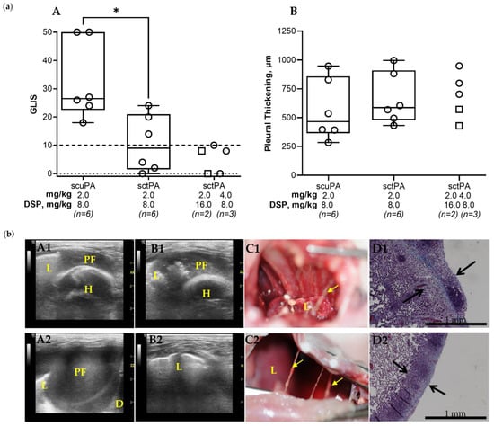 DSP Increases the Efficacy of Alteplase for Treatment of Chronic Empyema in Rabbits. (a) (A) Animals with empyema were treated with (from left to right): sctPA 2.0 mg/kg with 8.0 mg/kg DSP (n = 6), scuPA 2.0 mg/kg with 8.0 mg/kg DSP (n = 6), sctPA 2.0 mg/kg with 16.0 mg/kg DSP (n = 2; squares), or sctPA 4.0 mg/kg with 8.0 mg/kg DSP (n = 3; circles). The efficacy of fibrinolytic therapy was measured using GLIS (GLIS ≤ 10, at or below the dashed line indicates successful outcome). Statistically significant differences between outcomes were determined using Mann–Whitney test; * denotes p < 0.05. (B) Pleural thickening (µm) at 24 h after treatment (from left to right) with: sctPA 2.0 mg/kg with 8.0 mg/kg DSP (n = 6), scuPA 2.0 mg/kg with 8.0 mg/kg DSP (n = 6), sctPA 2.0 mg/kg with 16.0 mg/kg DSP (n = 2; squares), or sctPA 4.0 mg/kg with 8.0 mg/kg DSP (n = 3; circles). (b) Successful treatment with 4.0 mg/kg sctPA with 8.0 mg/kg DSP (GLIS = 8; A1–D1) and 2.0 mg/kg sctPA with 16.0 mg/kg DSP (GLIS = 8; A2–D2). Chest ultrasonography (yellow arrows—fibrin, L—lung, PF—pleural fluid; D—diaphragm, H—heart) at 24 h after the treatment prior to (A1,A2) and after (B1,B2) drainage of the pleural fluid; a photograph demonstrating the pleura at time of necropsy (C1,C2); and Trichrome staining (collagen is blue) of paraffin embedded lung tissue at 4× magnification. Pleural thickening is shown with black arrows (surface to basement membrane). (D1,D2).
