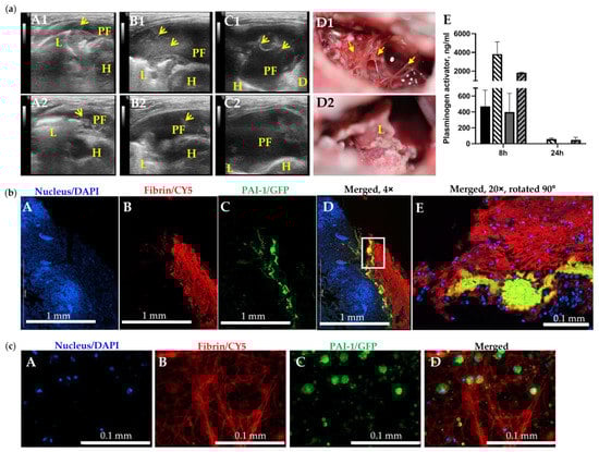The Slow Rate of Intrapleural Fibrinolysis and PAI-1 Entrapped in Fibrin May Contribute to Failure of IPFT in Treatment of Chronic Empyema in Rabbits. (a) Failed (A1–D1) and successful (A2–D2) IPFT outcomes in rabbits with advanced-stage empyema were evaluated via ultrasonography (A1–C1,A2–C2) and gross imaging (D1,D2). Representative images of chest ultrasonography (A1,A2) immediately prior to (yellow arrows—fibrin, L—lung, PF—pleural fluid; D—diaphragm, H—heart ), (B1,B2) at 8 h after, and (C1,C2) at 24 h after treatment with bolus injection of sctPA (4.0 mg/kg), and gross images of the pleural space (D1,D2) with GLIS = 50 (A1–D1) and GLIS = 0 (A2–D2); (E) High levels of active plasminogen activator in samples of pleural fluid collected at 8 h after treatment with sctPA (black bar) or scuPA (gray bar) together with 6–8-fold higher levels of fibrinolysin antigens (hatched bars). At 24 h after treatment, plasminogen activating activity was completely suppressed (below level of detection), although antigen is still present. (b) PAI-1 is detectable in fibrin organizing in advanced-stage (7 d) empyema in rabbits. Fixed rabbit lungs with chronic empyema were paraffinized, sectioned, and attached to adhesive slides. Double-labeled immunofluorescence staining were performed, probing for nuclear stain (DAPI, Hoechst 33342), PAI-1 (GFP, AF 488), and Fibrinogen (CY5, AF 647). Imaging was performed at 4× (A–D) and 20× (E) magnification using Cytation 5. (c) Visualization of PAI-1 expressing activated mesothelial cells embedded in a fibrin scaffold. Chronic empyema pleural fluids collected from diseased rabbits were three dimensionally cultured in a sterile 8-well EZ slide (Millipore Sigma, Inc., Burlington, MA, USA) for up to 7 days. Double-labeled immunofluorescence staining was performed on the cells, as described. Z-stack imaging was performed at 40× (A–D) magnification using Cytation 5.