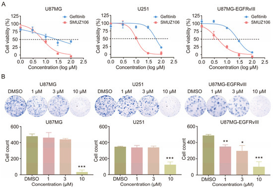 U87MG, U251, U87MG-EGFRvIII, and U87MG-TMZR cells were cultured in DMEM supplemented with 10% FBS and plated at low density in 96-well plates (2000 cells per well). Then, the cells were treated with different concentrations of gefitinib or compound SMUZ106 for a period of 72 h. MTT (5 mg/mL) was added to each well, and the cells were incubated for another 4 h at 37 °C. The optical density value at 570 nm was measured using a microplate reader (TECAN, Männedorf, Switzerland).