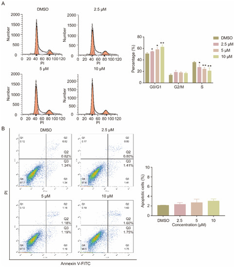 U87MG-EGFRvIII cells were seeded into 6-well plates and treated with different concentrations of the compound SMUZ106 (2.5, 5, and 10 μM) for 48 h. Following the treatment, the cells were harvested, washed twice with cold PBS, and fixed overnight at 4 °C in 70% ethanol, then stained with PI solution to analyze the cell cycle distribution via flow cytometry. The results were determined using the ModFit LT 5.0 software. Each assay was performed in triplicates.
