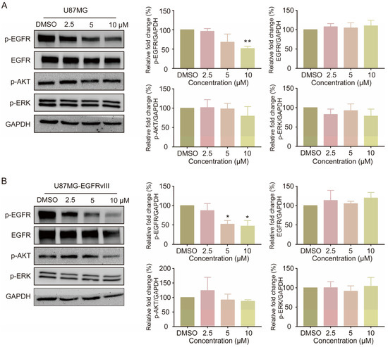 (A) U87MG cells and (B) U87MG-EGFRvIII cells were treated with the three concentrations of SMUZ106 or DMSO for 48 h. Statistical values represent the mean ± S.D. of three independent experiments, (*) p < 0.05, (**) p < 0.01, compared to the control group (DMSO).