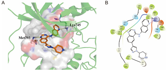 Molecular dynamics simulations showed that SMUZ106 stably bound to the ATP pocket of EGFR (Figure 4). The quinazoline ring of SMUZ106 formed a hydrogen bond with the backbone of the hinge area Met793 of EGFR, which is the main characteristic of most kinase inhibitors targeting the ATP site. The quinolone ring of SMUZ106 occupied the hydrophobic pocket and interacted with Lys745 via the hydrogen bond, while the piperidine part extended to the solvent area. The binding free energy of SMUZ106 in EGFR was estimated by MMGBSA methods to be −18.85 kcal/mol (Table S1). Both the binding conformation and binding free energy suggested that compound SMUZ106 presented appropriate affinity binding to EGFR, which is consistent with the kinase inhibitory data (compound 12d, IC50: 44.1 nM) [17].