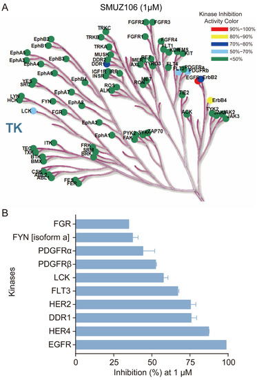 To explore the broader kinase selectivity, we tested the selectivity of compound SMUZ106 by screening it in a panel of 76 tyrosine kinases using the HTRF KinEASE-TK assay. Consistent with our expectations, compound SMUZ106 exhibited excellent selectivity to EGFR at 1 μM concentration (Figure 5A). Additionally, compound SMUZ106 showed poor inhibitory activity against HER4 and HER2 with percentages of 87.32% and 75.39%, respectively, compared to EGFR (98.73%) (Figure 5B). The data obtained from previous articles by our research group demonstrated that the IC50 values of the compound for HER2 and HER4 kinases were 874 and 930 nM, respectively (Figure S1) [17]. Therefore, the results show that compound SMUZ106 is a novel and highly selective EGFR inhibitor.