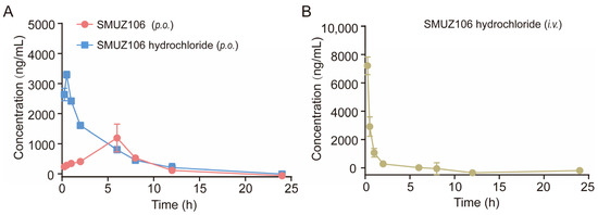 (A) The compounds SMUZ106 and SMUZ106 hydrochloride after p.o. administration at 100 mg/kg (mean ± SD, n = 3). (B) SMUZ106 hydrochloride after i.v. administration at 25 mg/kg (mean ± SD, n = 3).