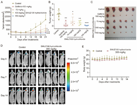 (A) The growth curves of tumors on 21 days. (B) The tumor sizes after SMUZ106 hydrochloride oral administration for 21 days in a nude mouse subcutaneous tumor model inoculated with U87MG-EGFRvIII cells (n = 5). (C) The tumor weight changes of nude mice on 20 days. (D) U87MG-EGFRvIII luciferase-transfected cells were intracranially injected into mice using a stereotactic frame. The tumor volume was measured using IVIS imaging (n = 4). (E) The body weight of the mice was measured daily for 14 days. (*) p < 0.05, (**) p < 0.01, (***) p < 0.001 compared to the control group (Solvent group).