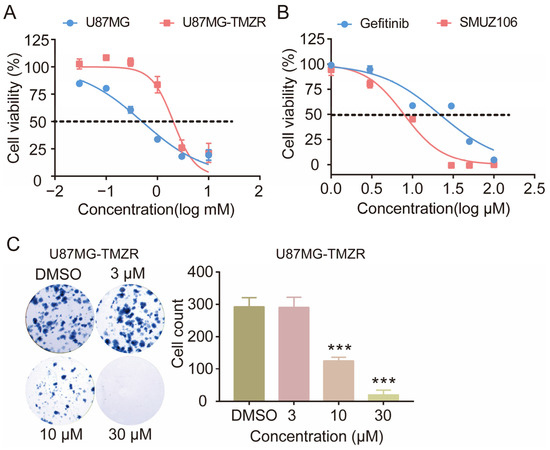 The emergence of TMZ-resistance behavior limits its anti-GBM activity. The activation of DNA repair pathways is the principal mechanism leading to TMZ resistance; therefore, it was determined that drugs targeting key pathways through different mechanisms can treat TMZ-induced drug-resistant cancer cells [22]. In this study, SMUZ106 was an EGFR inhibitor, which is distinct from the TMZ-resistance pathway. Therefore, we selected U87MG-resistant cells induced by TMZ to evaluate the effect of SMUZ106. The results showed that the inhibitory activity of TMZ on TMZ-resistant U87MG cells (U87MG-TMZR) (IC50: 2045 μM) was much greater than that of U87MG cells (IC50: 501.4 μM) (Figure 8A). Further experimental results showed that SMUZ106 could inhibit the growth of TMZ-resistant U87MG cells (IC50 value of 7.86 μM) (Figure 8B). Similarly, the results obtained for clone formation also showed that SMUZ106 could inhibit the proliferation of TMZ-resistant U87MG cells (Figure 8C). Thus, the EGFR inhibitor SMUZ106 is a potential compound used to overcome TMZ resistance.