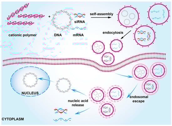 Cationic polymers are a type of non-viral vector (Figure 1). A common feature of their structures is the presence of many positively charged groups in the molecule, which are protonated into positively charged polymers. Cationic polymers can bind nucleic acids through electrostatic interactions and condense them into small nanoparticles []. Positive charges improve interactions with negatively charged cell membranes, and aid polyplexes in escaping endosomes before lysosomal degradation occurs. []. Subsequently, polyplexes escape from the endosome by the proton sponge effect that is mediated by positively charged groups on the cationic polymer []. Furthermore, nucleic acids must dissociate from cationic polymers before finally performing their function [].