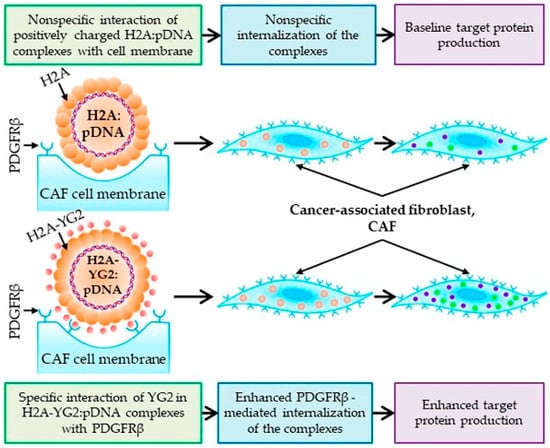 Histones are the major protein components of chromatin. They serve as spools for DNA winding, and play important roles in gene regulation. Histones include H2A, H2B, H3 and H4, and H1, all of which have positively charged residues (lysine and arginine) and nuclear location signals (NLS) [,,]. As a result, they are able to bind negatively charged nucleic acids through electrostatic interactions, and naturally target the nucleus []. The histone-mediated transfection of nucleic acids, called histonefection, is effective in transfecting DNA, mRNA, and siRNA, especially into primary cell lines []. Although the mechanism has not yet been investigated, histone entry into cells may not be achieved by endocytosis, as histones have been observed to cross cell membranes by passive diffusion []. Another advantage of histones as transfection reagents is their extremely low cytotoxicity. For instance, histone H1 and histone H1-like proteins have not been observed to be cytotoxic [,]. However, foreign histones are believed to affect the formation of nucleosomes by disrupting chronic histones and affecting normal replication and transcription [,]. Consequently, when histones are used in gene transfer studies, the interference of exogenous histones with the transcription of the underlying genes should be taken into account. A novel non-viral fibroblast-targeting DNA carrier called H2A-YG2 was made by fusing histone H2A with the PDGFR-binding peptide, YG2 (Figure 4) []. The fusion vector increased DNA internalization only in PDGFRβ-positive cells, indicating targeted gene delivery of the H2A-YG2 vector to PDGFRβ-positive tumor stromal cells.
