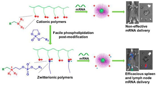 Systemic mRNA delivery to spleen and lymph nodes facilitated by the zwitterionic phospholipidation of cationic polymers. Reprinted with permission from Ref. []. Copyright 2021, American Chemical Society.