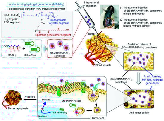 - Kim, D.Y.; Ju, H.J.; Kim, J.H.; Choi, S.; Kim, M.S. Injectable in situ forming hydrogel gene depot to improve the therapeutic effect of STAT3 shRNA. Biomater. Sci. 2021, 9, 4459–4472. [Google Scholar] [CrossRef]