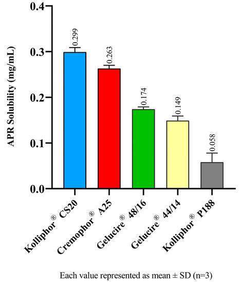 The equilibrium solubility of APR in a surfactant solution is correlated to the maximum amount of APR that can be dissolved in relevant aqueous media. SNEDDS formulations are diluted by gastrointestinal fluids after oral administration. This study offers an opinion about the amount of APR that remains dissolved after dilution. The 1% (w/v) surfactant solutions correspond to a 100-fold dilution of formulations. The equilibrium solubility of APR in surfactant solutions is shown in Figure 1. Kolliphor® CS20 maintains a higher amount of APR dissolved in the aqueous phase.