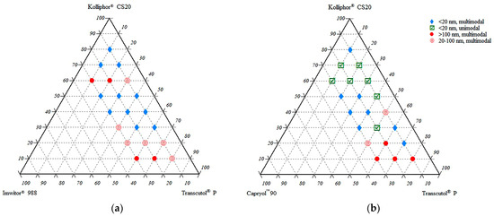 Droplet size and distribution of ternary systems. (a) System consisting of Imwitor® 988, Kolliphor® CS20, and Transcutol® P; (b) System consisting of CapryolTM 90, Kolliphor® CS20, and Transcutol® P.