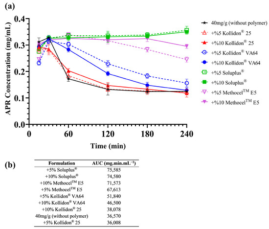 Results of the in vitro drug precipitation test (values represented as the mean of three replicates in the graph): (a) Precipitation curves; (b) The AUC values of each curve calculated by using averages.