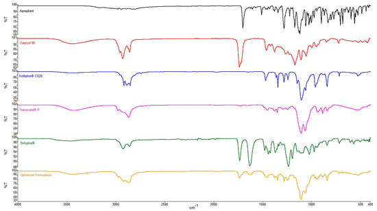 Solubilization of the API in the excipients is one of the key aspects of developing a successful SNEDDS formulation. The oily phase and cosolvent selections were based on the results of our previous study [24]. Imwitor® 988 and CapryolTM 90 were selected as the oily phase, and Transcutol® P was selected as cosolvent due to their ability to dissolve more APR. Imwitor® 988 (glycerol monocaprylate, type I) consists of a glycerol ester of caprylic (>90%) and capric (<10%) acid. CapryolTM 90 (propylene glycol caprylate, type II) is an ester (mainly composed of monoesters) obtained by the esterification of caprylic acid with propylene glycol [36,37]. It was concluded that the solubility of APR is higher in oily compounds that are relatively polar and have surface-active properties. The monoglycerides in Imwitor® 988 are compounds with high polarity. In addition, mono- and diglycerides also have surface-active properties [38]. CapryolTM 90 is also a surface-active excipient. It is a nonionic water-insoluble surfactant with an HLB of 5, mainly used as a cosurfactant in oral lipid-based formulations. Transcutol® P dissolved more APR than other investigated cosolvents. It is a well-known excipient known to dissolve many drugs with poor water solubility. Consequently, formulations with the mentioned excipients were developed due to their ability to solubilize APR.
