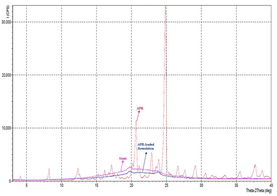 XRPD diffractograms of APR powder (red), blank optimized formulation (pink), and APR-loaded optimized formulation (blue).