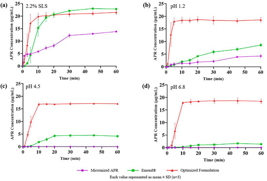 In vitro dissolution tests were performed according to the USP 39—NF 34 monograph and FDA recommendations for APR powder, SNEDDS, and marketed product of APR (Emend®). Dissolution studies were carried out using the dissolution tester (Pharmatest, Hainburg, Germany) with paddle apparatus at 100 rpm and 37 °C. Formulations equivalent to 40 mg of APR were added to each vessel. A 2.2% aqueous sodium lauryl sulfate solution (monograph medium) and various buffer solutions (pH 1.2 HCl buffer, pH 4.5 acetate buffer, and pH 6.8 phosphate buffer) were used as the dissolution media. Samples (1 mL) were withdrawn at predefined time points (1, 3, 5, 10, 15, 20, 30, 45, and 60 min) and passed through a 0.45 µm filter. Then, the dissolution volume of the medium was made to reach the initial volume (900 mL) with fresh medium to maintain a constant volume. APR concentration in filtrates was determined by the HPLC.
