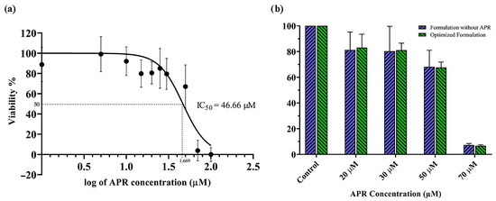 Results of in vitro cytotoxicity tests: (a) The toxicity of APR on the Caco-2 cell line; (b) % viability results of optimized formulation with and without APR.