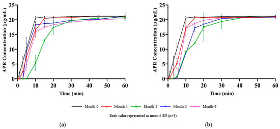 More than 85% (Q + 5%) of the APR was dissolved in the first 30 min at all the time points. The variability was related to the disintegration time of hard gelatin capsule shells. It was visually observed that the capsule shells were opened in the first 10 min of the dissolution test, and the formulation was released into the medium. The formulation in capsules became a liquid state at 37 °C and easily dispersed into the dissolution medium just after the rupture of the capsule shells. Since the dispersion of formulation and dissolution process was rapid, it was observed that a few-minute difference between the rupture time of the capsules shifted the dissolution rate profile. The shift of the dissolution profiles was random and independent of months, which supported the idea that profile shift is related to the capsule disintegration time rather than the change in formulation over time.