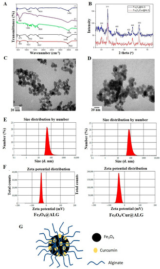 Structural and morphological analysis of NPs. (A) FTIR spectra of (1) alginate, (2) Fe3O4 nanoparticles, (3) curcumin, (4) Fe3O4@ALG, and (5) Fe3O4/Cur@ALG. (B) X-ray diffraction pattern of the Fe3O4@ALG and Fe3O4/Cur@ALG systems. (C,D) TEM images and (E,F) size and zeta potential distribution of the Fe3O4@ALG and Fe3O4/Cur@ALG nanosystems, respectively. (G) The schematic structure of Fe3O4/Cur@ALG nanoparticles.