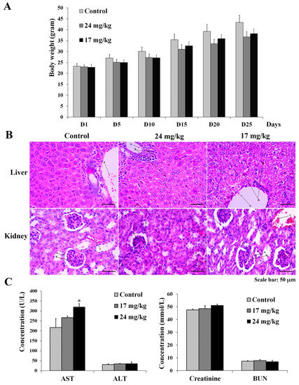 The acute toxicity assay of Fe3O4/Cur@ALG NPs was performed at five doses ranging from 80 to 120 mg/kg. After 72 h after the intravenous injection, none of the mice in the five treatment groups died. Moreover, there were no differences between the control and treated groups in terms of performance and behavior (Figure 2A). This result indicates that Fe3O4/Cur@ALG NPs does not elicit acute toxicity in mice in the range of the tested doses. Hence, we chose two doses, 24 mg/kg and 17 mg/kg, equal to 1/5 and 1/7 of 120 mg/kg, respectively, which was the highest dose used in the acute toxicity test and the sub-chronic toxicity test. In the two treatment groups, each mouse was continuously injected with 24 or 17 mg/kg/day for 30 days. The body weight of the mice was measured every five days, and the functional activities of the liver and kidney were evaluated at the end of the experiment. The results show that there is a modest decline in the body weight of the treated mice (2–10%) compared to that of the control; however, the difference is not significant (p > 0.05) (Figure 2A). Notably, two mice died, one on day 15 and one on day 20, in both treatment groups (24 or 17 mg/kg/day, respectively), accounting for 20% of the deaths. Histological analysis indicates that Fe3O4/Cur@ALG NPs are present in small amounts in the liver but not in the kidneys. For histological analysis, we observed the nanoparticle conglomerate-like structures present in the liver, but not kidney tissues in the mice treated with NPs. In addition, the histological structures of livers changes compared to those in the control group, with the appearance of vacuolated hepatocytes (Figure 2B). In addition, biochemical assay data indicate that both AST and ALT values are higher in the treated mice than in the control mice, with a significant difference in AST values (p < 0.05), whereas the levels of BUN and creatinine do not change significantly (Figure 2C). Thus, the Fe3O4/Cur@ALG NPs likely accumulate in the liver, causing an increase in transaminase levels.