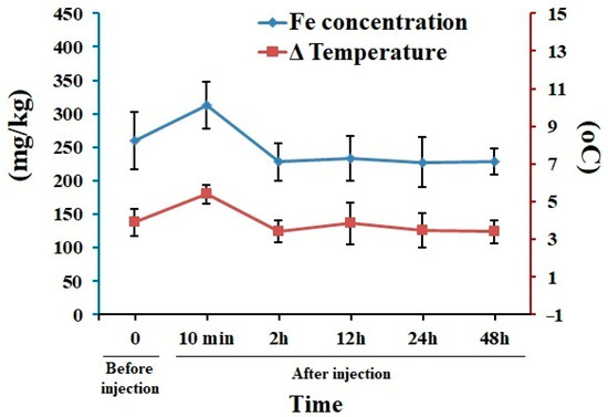 The lifetime of Fe3O4/Cur@ALG NPs in the blood. Data from the magnetic and AAS analyses reveal changes in the temperature (blue line) and Fe concentration (red line) over time after the intravenous injection of magnetic NPs. Data are presented as the mean ± SD (n = 5).